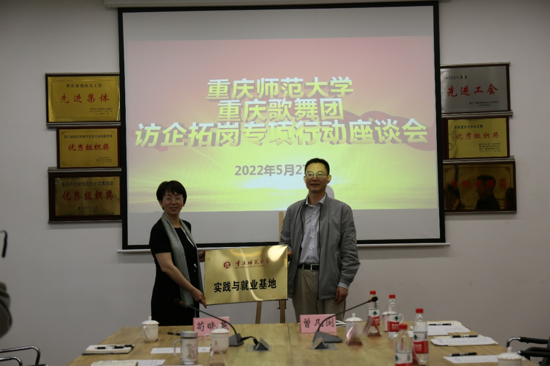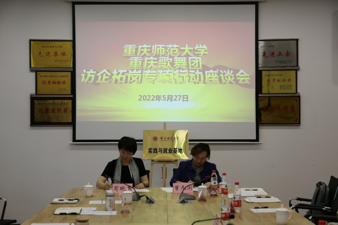 座谈会上,重庆师范大学与重庆市歌舞团现场签订了“重庆师范大学实践教学基地协议书” “重庆师范大学实践与就业基地协议书”并进行了揭牌。