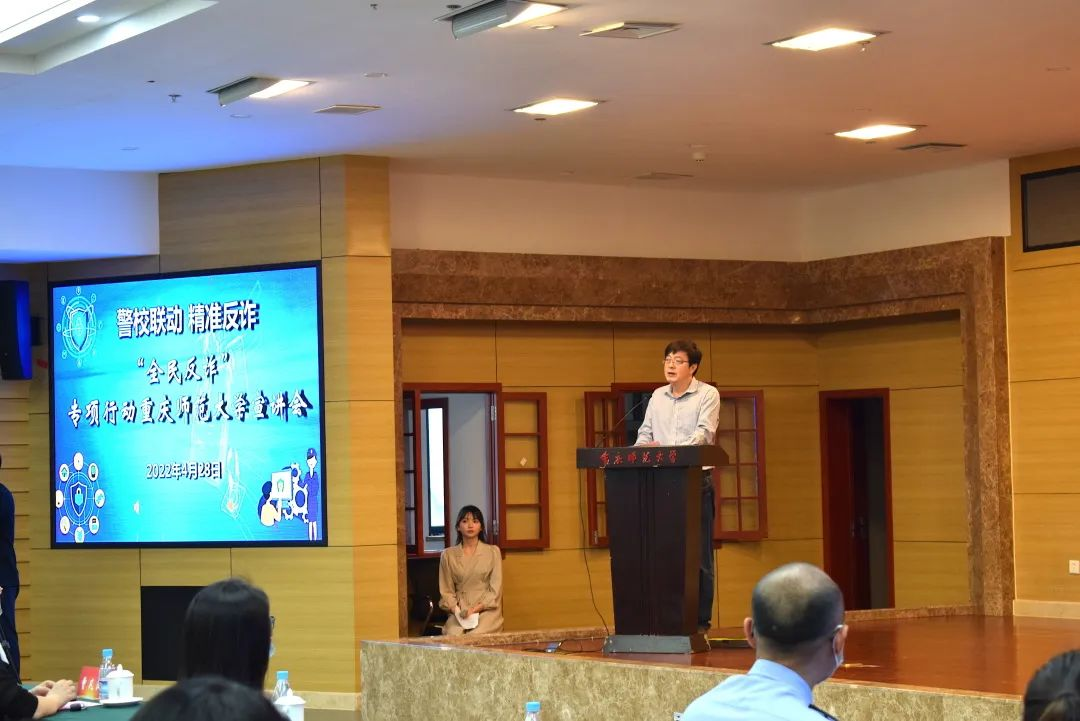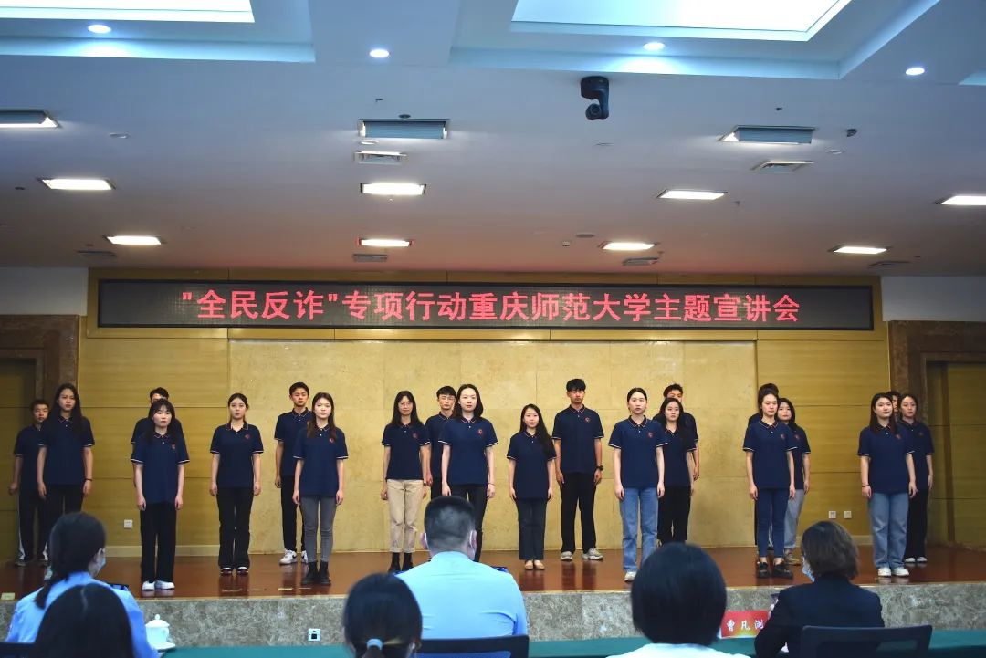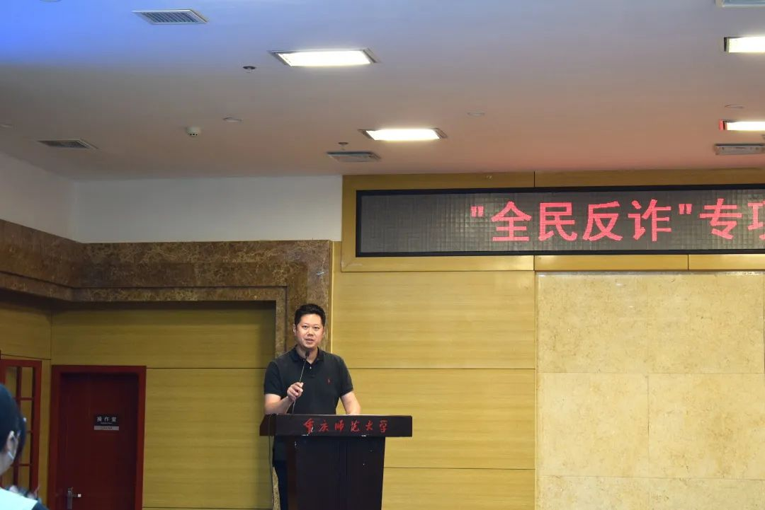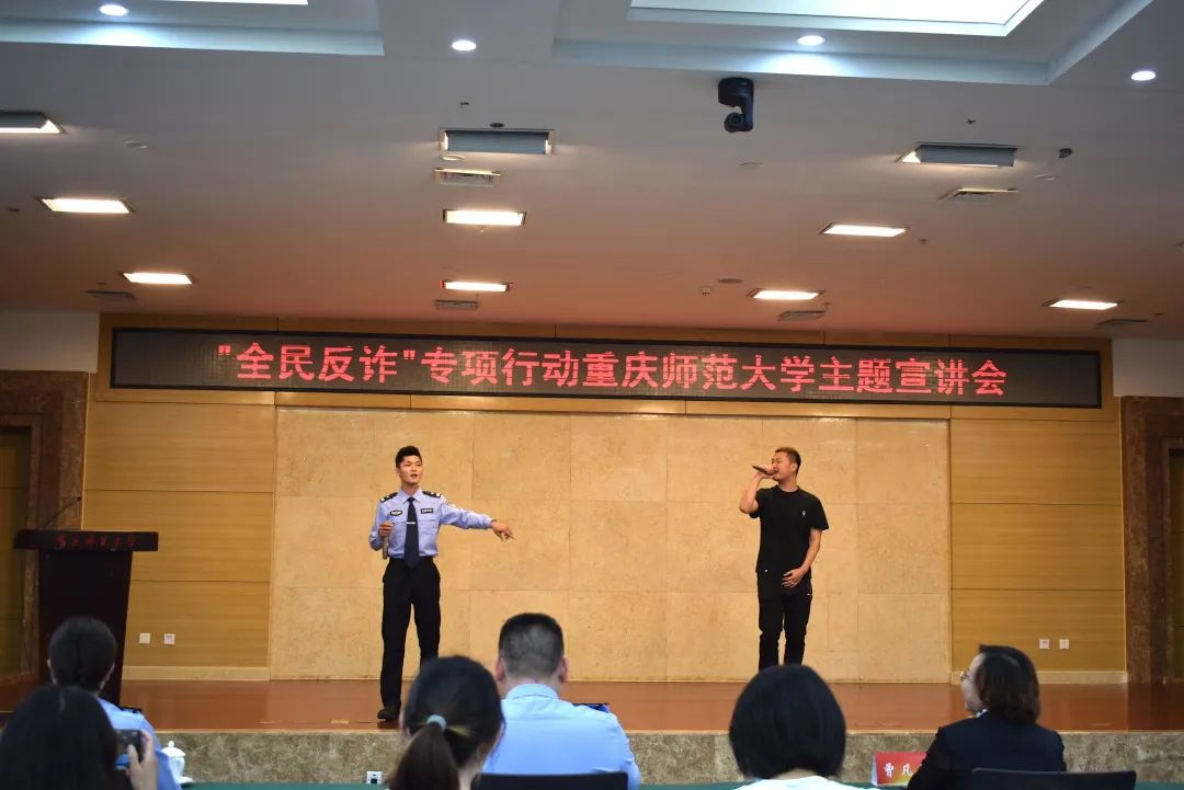 随着现代科技的发展,我们的生活有了极大的改善,但这也促使了许多人利用高科技诈骗钱财,破坏人们的财产利益。为进一步提高在校师生的防电信诈骗的意识和能力,有效遏制校园电信诈骗案件的发生,避免财产损失。2022年4月28日14点30分,由重庆高新区公安分局和重庆师范大学联合主办,音乐学院承办的“警校联动 精准反诈”主题宣讲会于博雅楼504会议室成功举行。yl23455永利党委书记曾凡浏、重庆高新区公安分局治安支队支队长唐治洋、音乐学院正处级组织员鲁福崇、治安支队副支队长兼女子突击队队长苏兰、保卫处副处长李鑫、yl23455永利党委副书记宋雪飞,以及我院2021级音乐表演一班、二班同学共同参与了此次别开生面的反诈公开课。