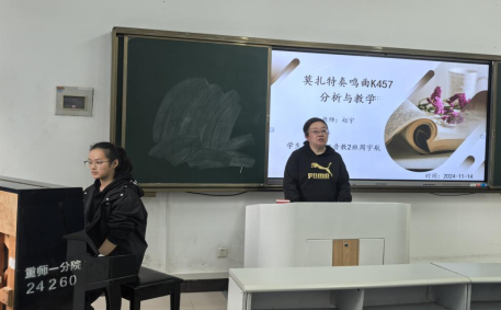 第三位进行教学示范的是赵宇老师。讲授的内容为莫扎特鸣奏曲K457分析与教学。赵宇老师结合PPT首先与观摩教师们分享了教材内容选择,并且讲解了此曲的背景和曲式结构,然后由演奏学生进行演奏,赵宇老师准确的指出了学生存在的问题,并进行了演奏示范,观摩老师们感受到了赵宇老师在教学过程中的严谨。
