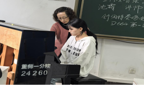 第二位进行教学示范的老师是周冰颖老师。讲授的内容为贝多芬降B大调第十一钢琴奏鸣曲OP22第一乐章。周冰颖老师首先进行上一堂课的课程复习再进行新课讲授,环环相扣。在新课讲授过程中周冰颖老师对重难点进行层层解剖,并且进行了一定的课程知识拓展,着重为学生讲解了演奏技巧,让学生能够快速掌握。整个教学过程让观摩老师们感受到了周冰颖老师授课过程中的细致。