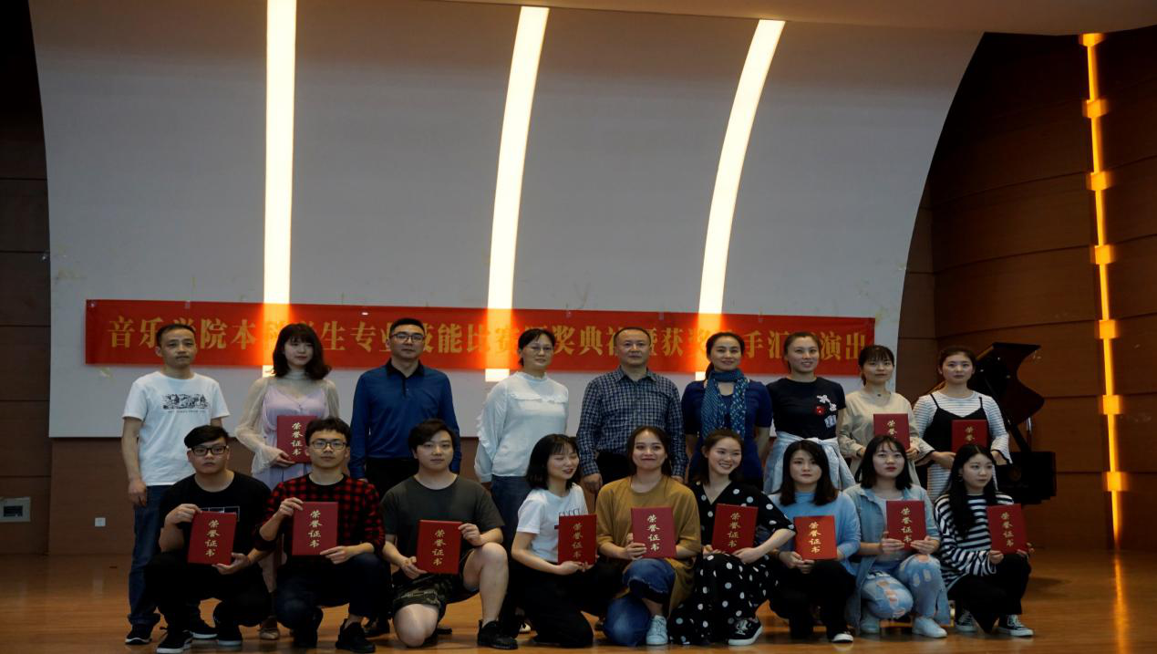 2019年4月18日下午16:00,“音乐学院本科生专业技能比赛颁奖典礼暨获奖选手汇报演出”在音乐学院8459排练厅顺利举行。音乐学院副院长孙伟、教科办主任崔凤明、音乐学系主任齐江、音乐表演系主任吴婧瑀、舞蹈系主任颜聪、声乐教研室主任王守梅、钢琴教研室主任李雪莲、流行音乐教研室主任谭安平、理论教研室主任杜刚、舞蹈教研室主任邓、王培出席观看了此次音乐会并对优秀学生进行了颁奖。孙伟副院长在致辞中表示:举办此次本科生技能汇报音乐会的目的是希望同学们在竞争中互相学习,取长补短,激发同学们的学习积极性。