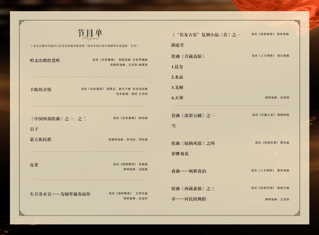 本场音乐会所选曲目均来自“改革开放以来中国钢琴作品选辑”丛书。该丛书精选1979年以来创作的钢琴音乐,适合具备一定演奏基础的音乐专业人士、高等院校师生和广大钢琴学习者研习使用,也可作为其他音乐工作者的重要参考资料。