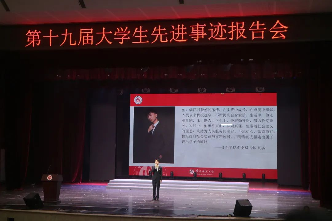 其中,我院2018级音乐表演一班的龚浩宇同学作为先进事迹报告团的一员,在大会上作出卓越汇报。
